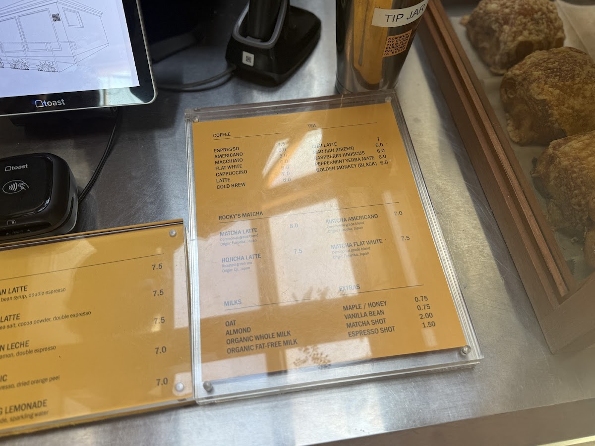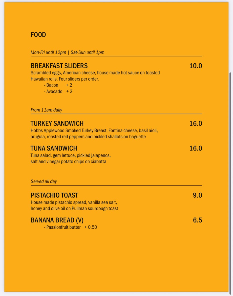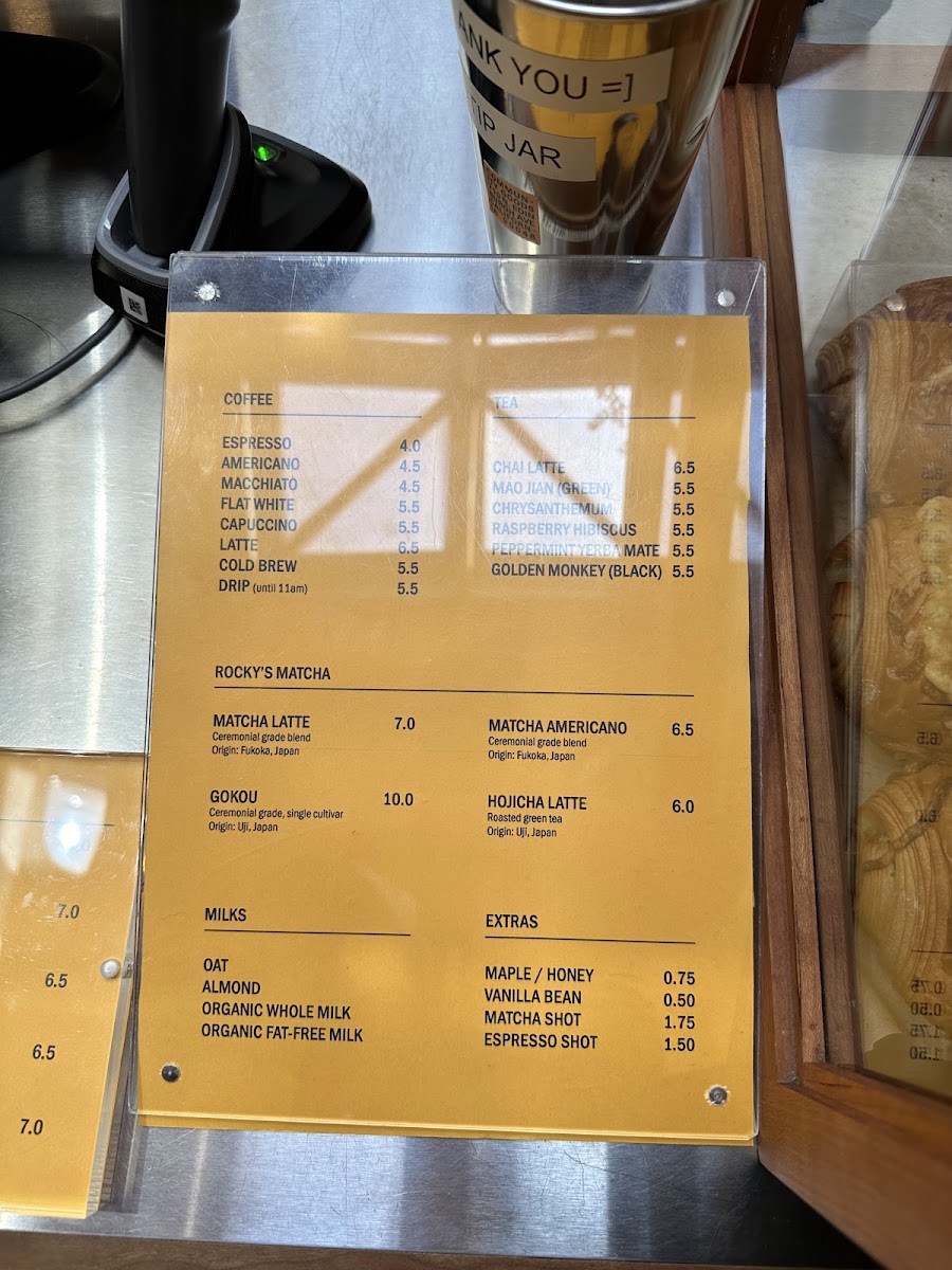 Pastries and Light Bites: The food menu includes a variety of pastries such as croissants (plain, pain au chocolat, tahini white chocolate), cinnamon knots, banana bread (vegan option with almond flour), baklava, and brownies. Additionally, there is a ham and cheese pastry combining ham, dijon, Gruyère, and cheddar cheeses, offering a savory option.