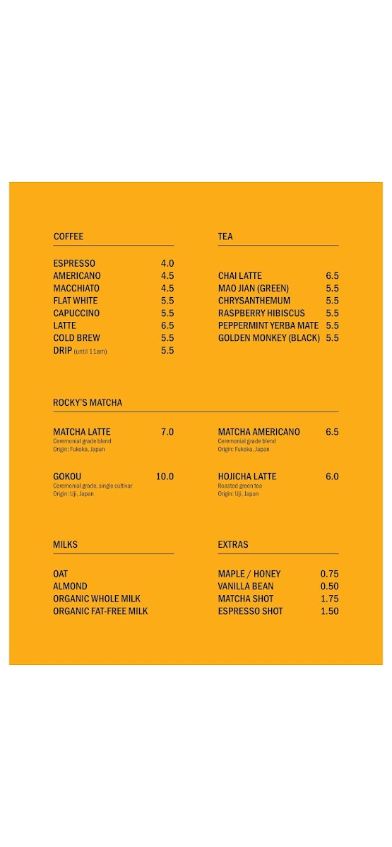Beverages: The drinks selection emphasizes specialty coffee and tea-based options, including multiple variations of matcha drinks such as salted maple matcha cappuccino, matcha tonic, and a Joe matcha latte. There are also other coffee preparations like the maple latte and hojicha spänner, alongside a range of tonics and lemonades featuring flavors like passionfruit and raspberry. Non-caffeinated choices include a babyccino and specialty cold beverages.
